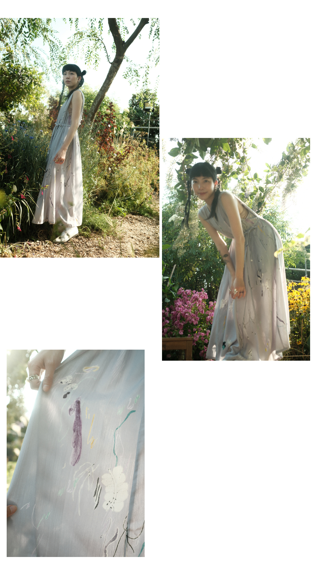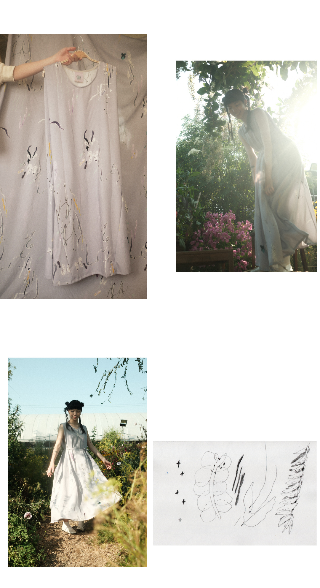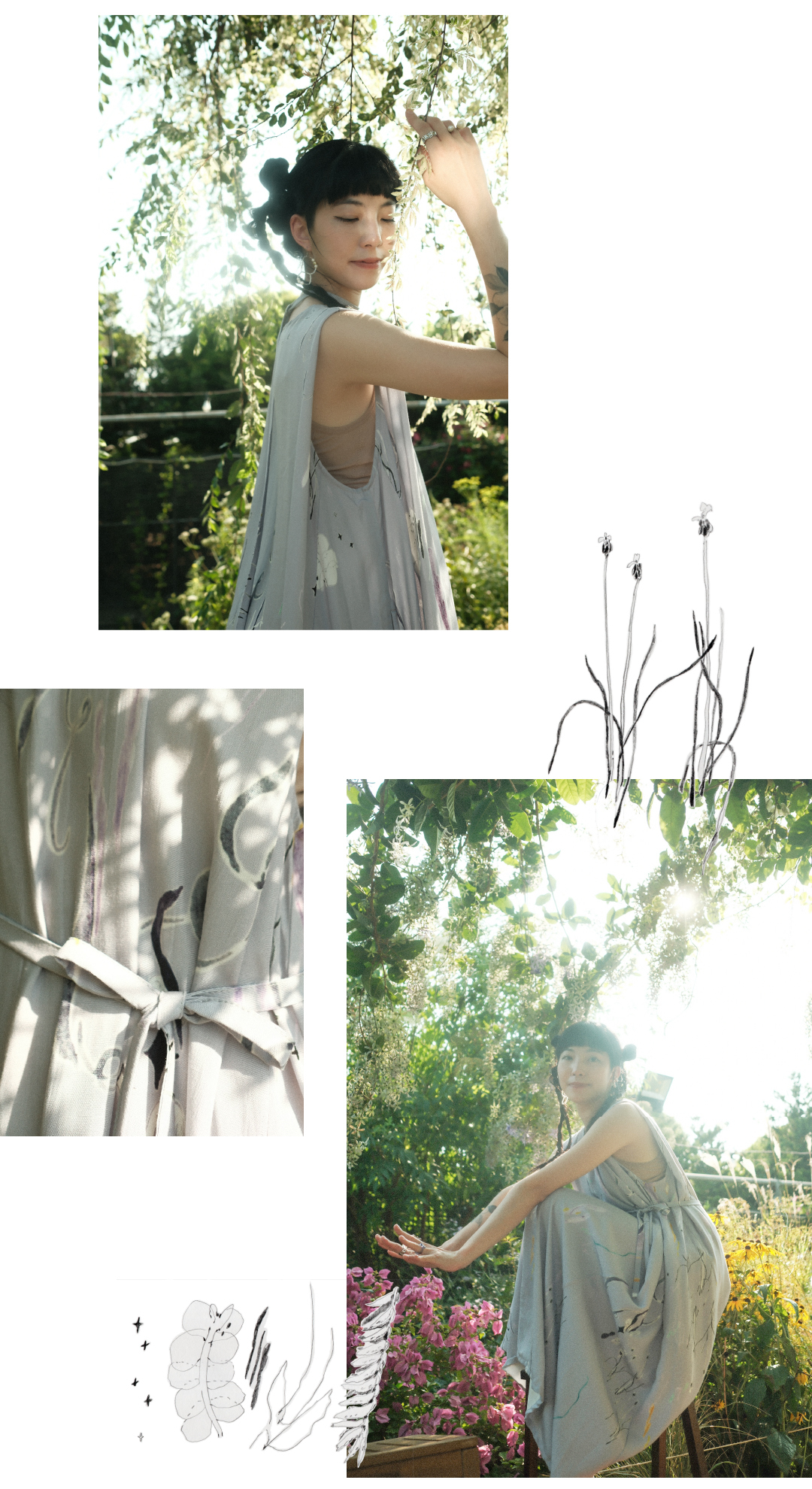 以台灣特有種「台灣黃眼草」為印花靈感,結合早田文藏的植物哲學與摺紙版型設計。選用親膚植物纖維,獨特肩膀反摺設計修飾手臂線條,讓平面布料躍升立體空間感。隱藏口袋與活動腰帶,兼具日常俐落與浪漫度假感,穿上台灣土地的自然美學。