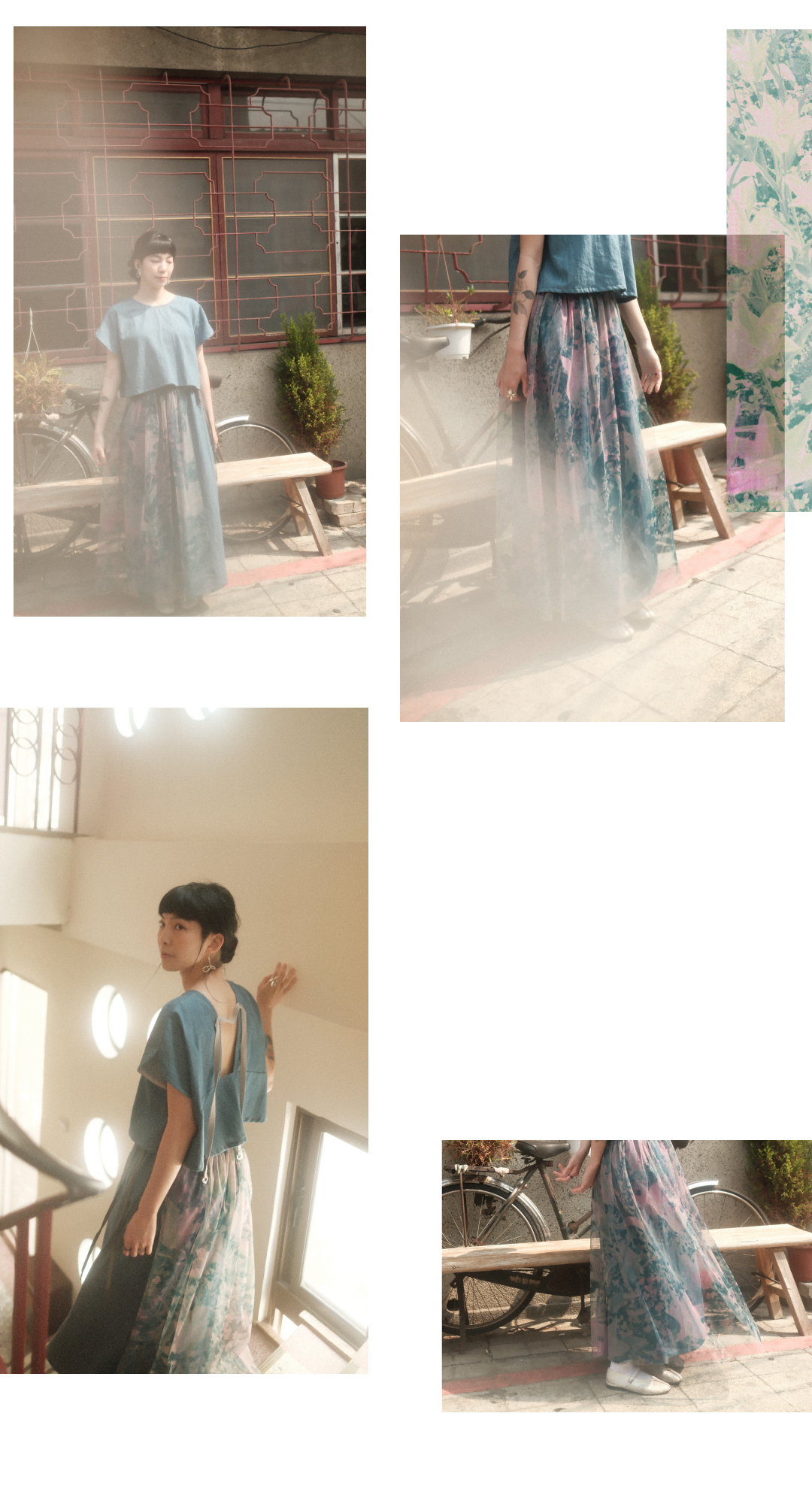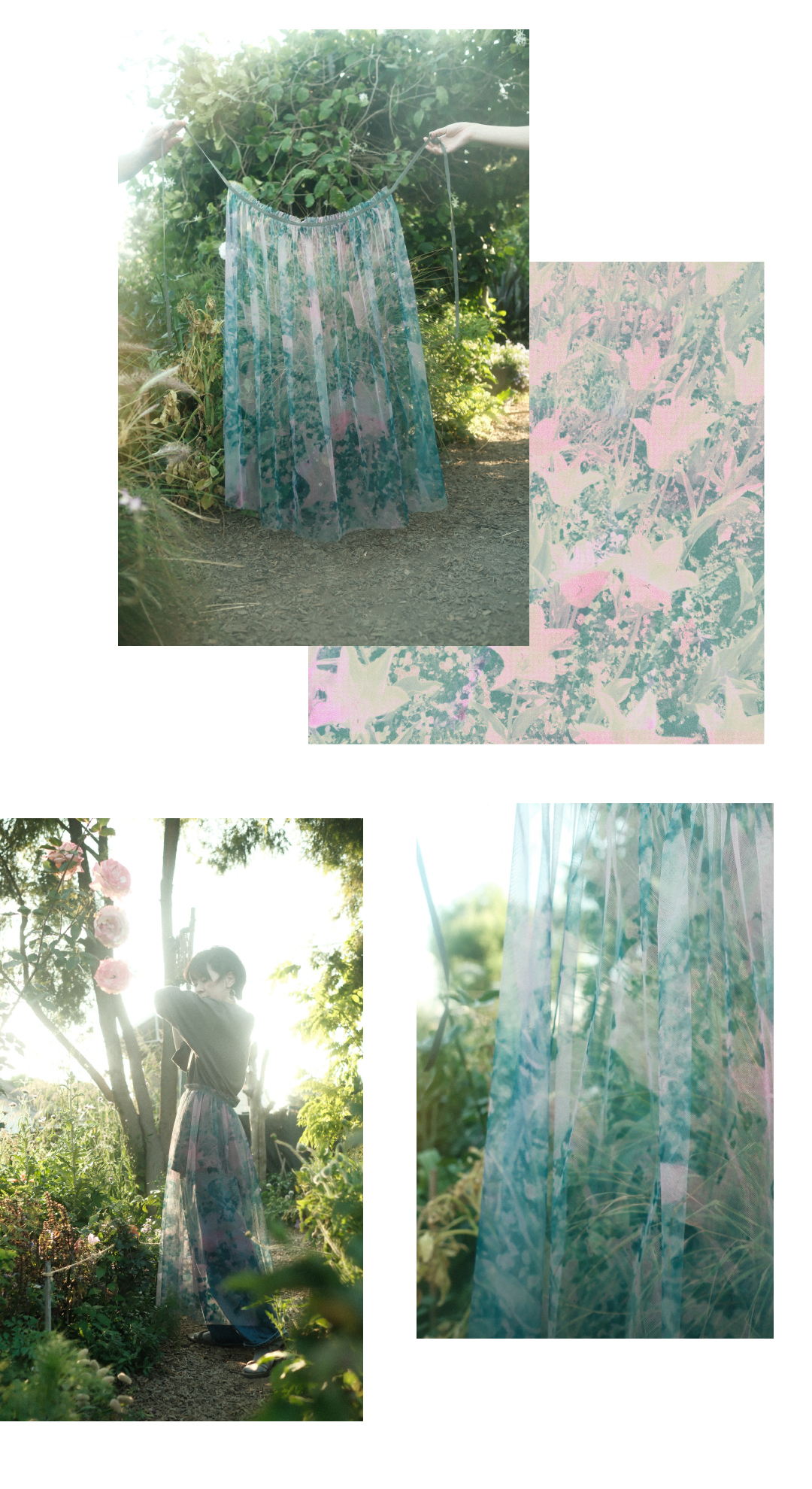 關於綠與粉的色彩實驗。在陽光的穿透下,手工渲染的層次堆疊出如迷霧般的份量感,讓每一吋紗質布料都閃爍著柔和的光影。