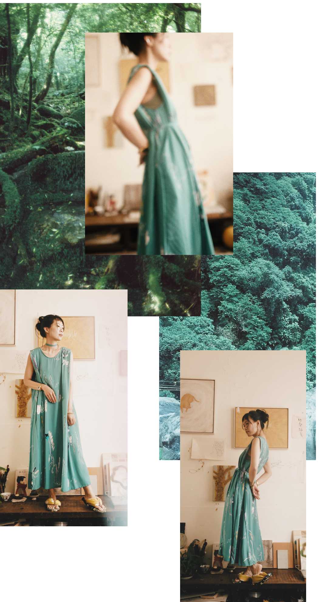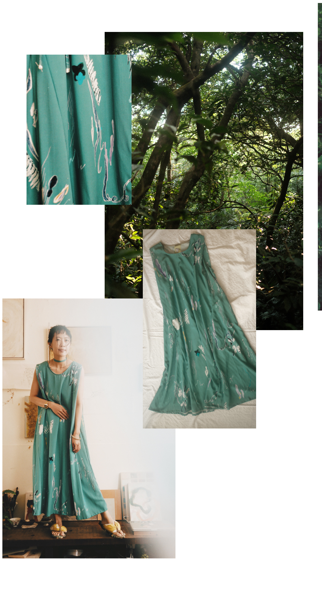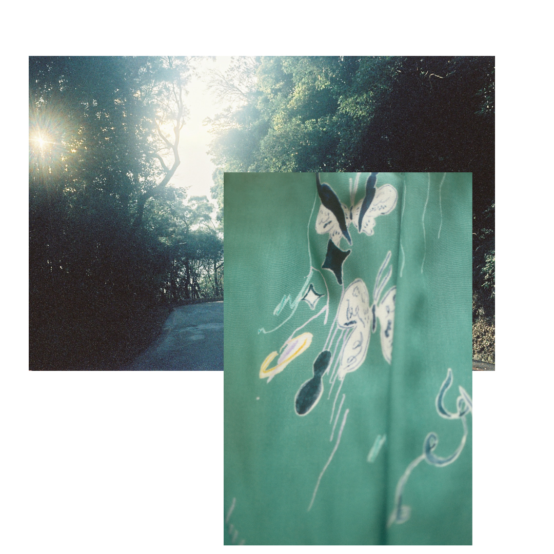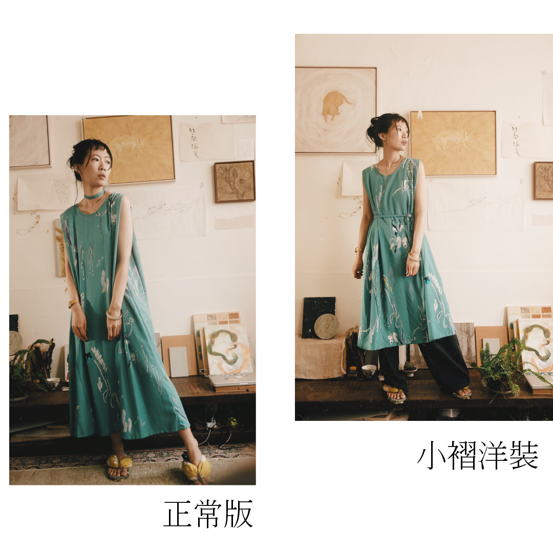 以台灣特有種「台灣黃眼草」為印花靈感,結合早田文藏的植物哲學與摺紙版型設計。選用親膚植物纖維,獨特肩膀反摺設計修飾手臂線條,讓平面布料躍升立體空間感。隱藏口袋與活動腰帶,兼具日常俐落與浪漫度假感,穿上台灣土地的自然美學。