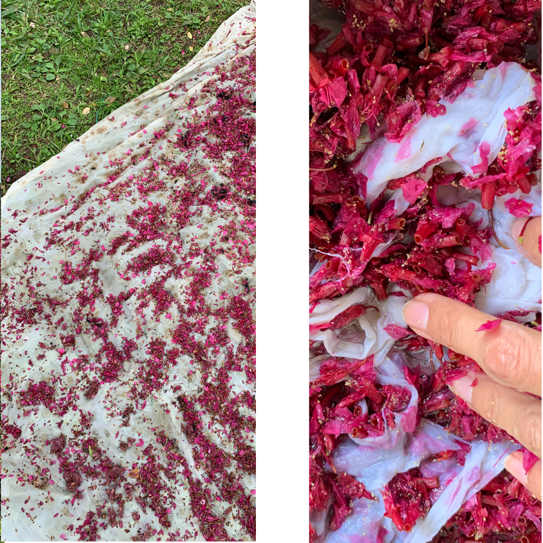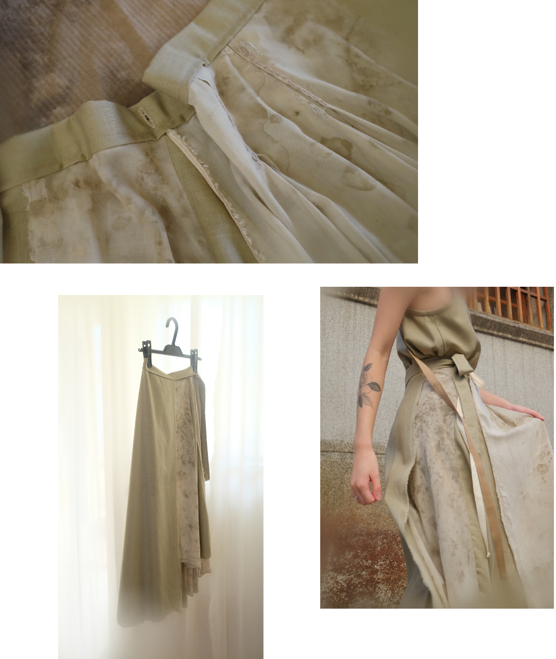 從櫻花樹落下的朵朵花瓣與草木灰一起在這塊布上作畫。